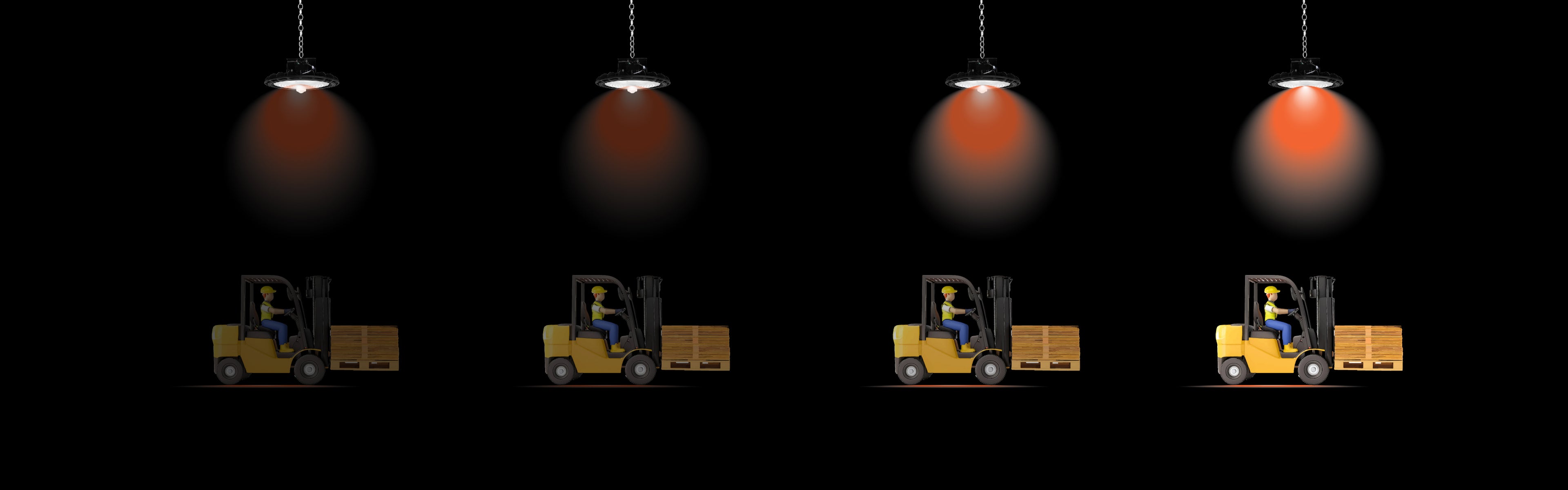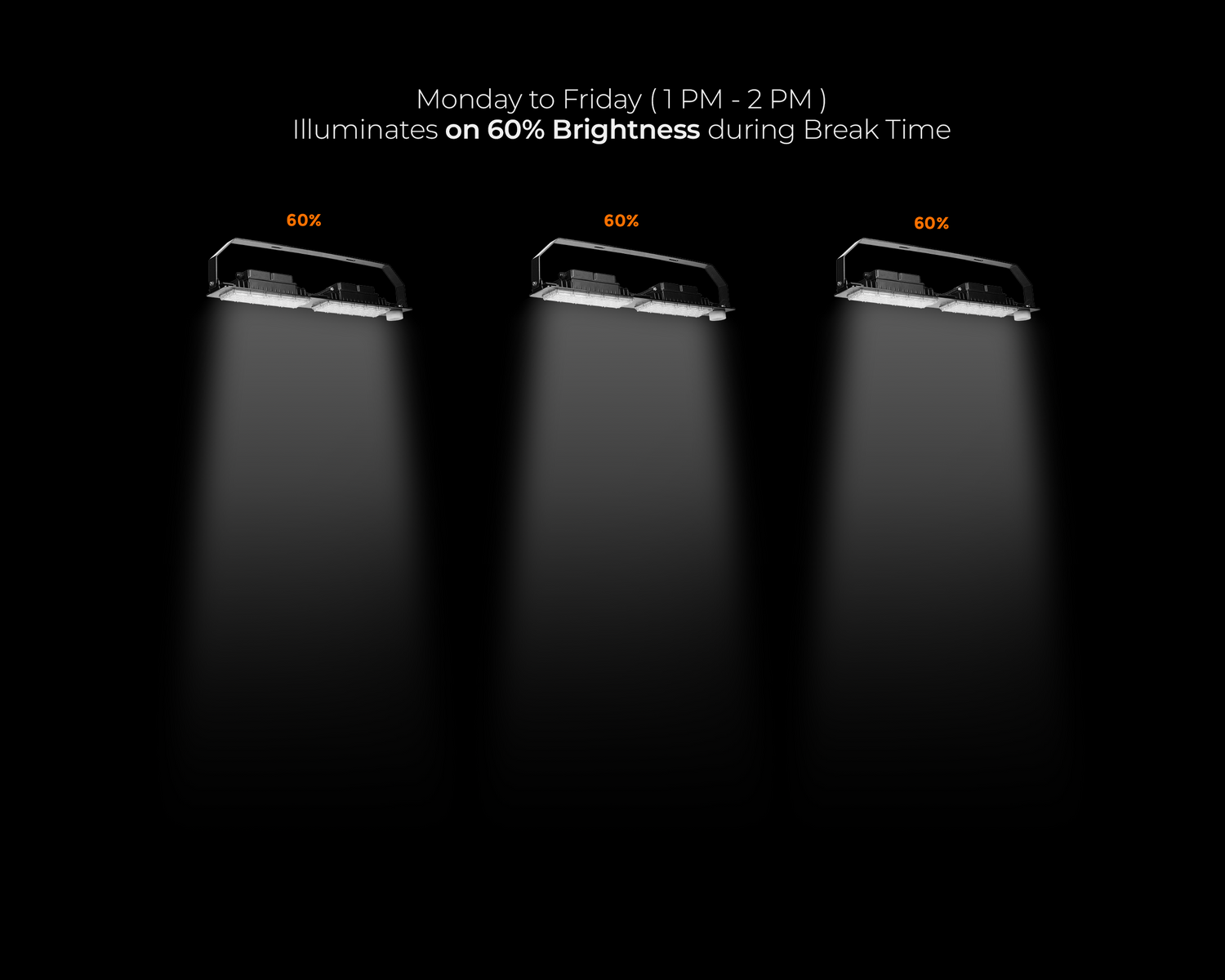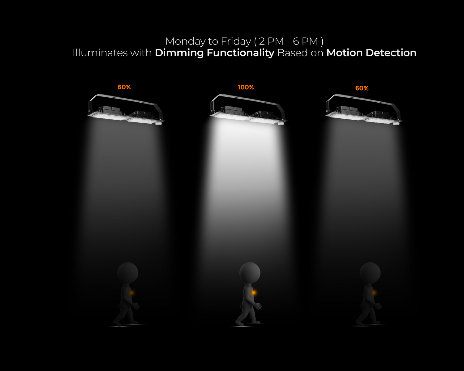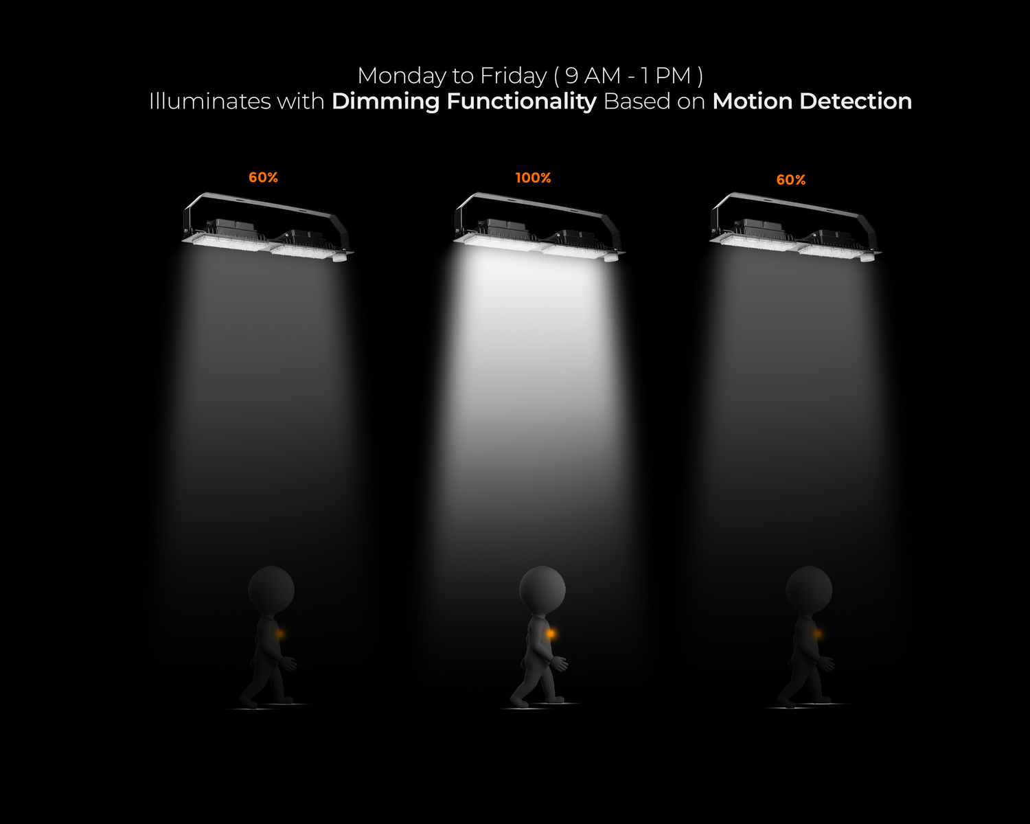 Maximize energy efficiency during peak morning hours. The system maintains a baseline safety light of 60%, instantly boosting to 100% brightness only when motion is detected—ensuring light is strictly where your workforce is.