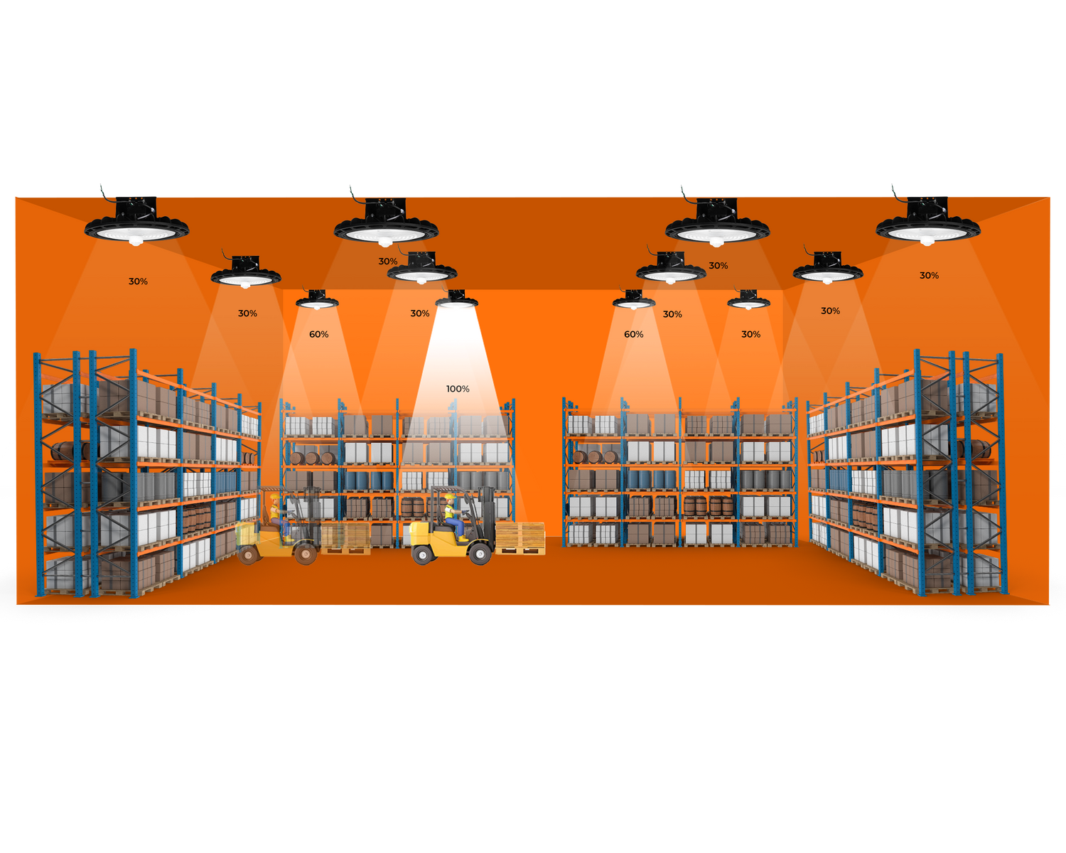 "Visualizing Adaptive Zones: Lights directly illuminates at 100%, adjacent zones at 60%, and unoccupied aisles to 30%."
